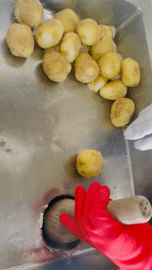 ポテトは、甘みとほくほく感が絶妙なバランスの国産品です。一つひとつ手作業で形成されるコロッケは、職人の技が光ります。